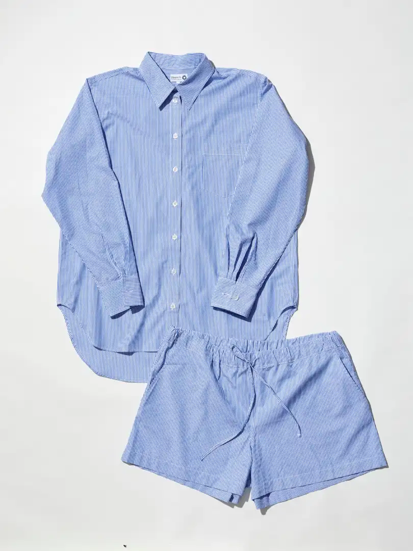 London-based swimwear label Hunza G has found success thanks to its elegant cuts and signature crinkle fabric, which is stretchy enough to fit any body shape and to see you through a lifetime of summer dips. Now the brand is expanding beyond its popular swimsuits for the first time with the Weekend capsule collection, a line of laid-back shirt-and-shorts sets. They come in blue striped cotton, as well as black-and-white linen and work both on the beach and as loungewear.