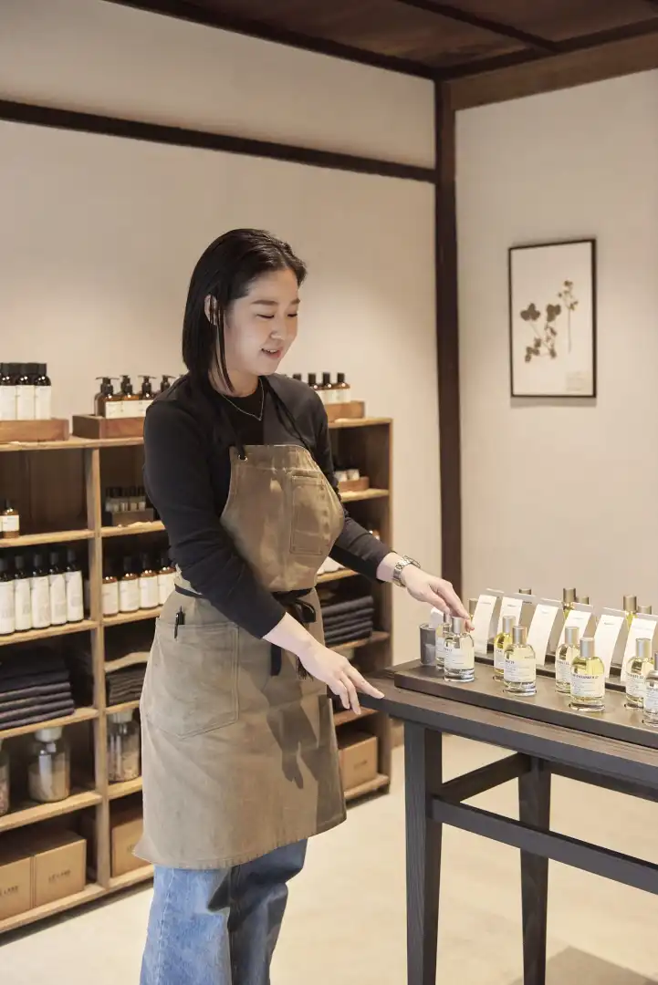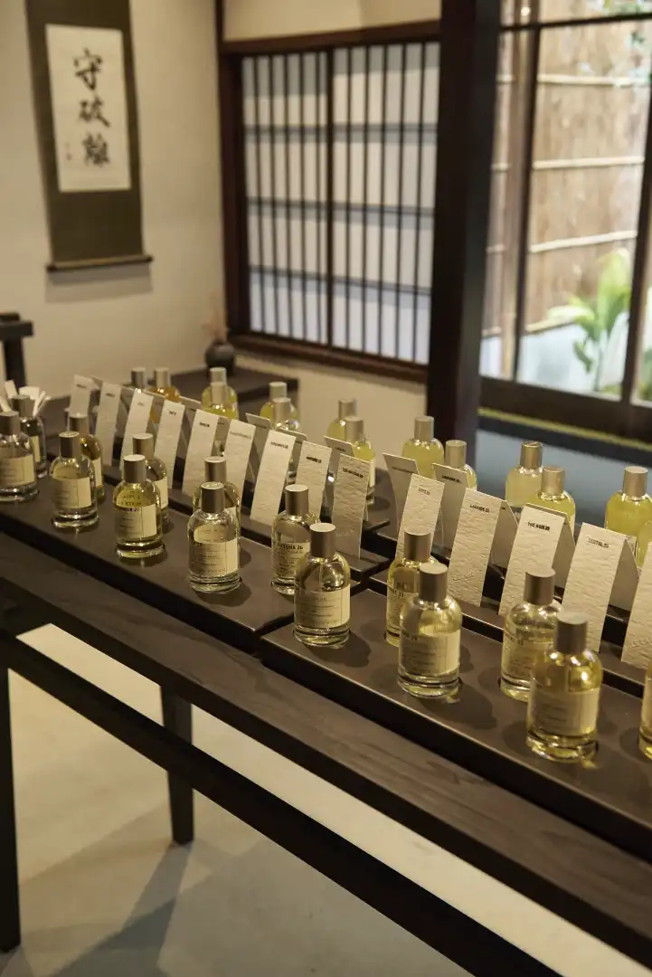 The atmospheric old building has been renovated with a light touch: door frames and walls have been left in a comfortably worn state and nothing feels overly restored. “It was about finding the right balance between preserving the past and bringing in new life,” says Deborah Royer, Le Labo Fragrances’s president and chief creative officer. The courtyard garden has been revived, while the oldkurastorehouse at the back has been turned into a small coffee stand. A tatami-mat room upstairs hosted a Kyoto calligrapher for the opening and will be used to welcome other craftsmen in the future. “We always try to connect with local artisans,” adds Royer, who tends to opt out of releasing traditional ad campaigns. “We don’t overdo the explanations; we try to [focus] everything around the fragrances.”