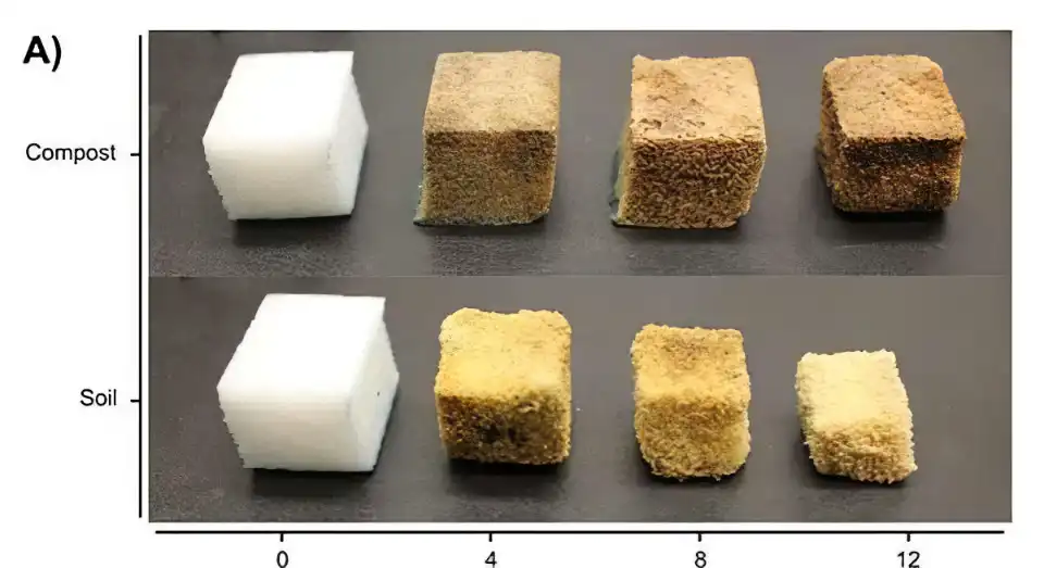 When the polyurethane is buried in soil (dirt), for just 12 weeks, it breaks down by about 71%. In the right conditions, it should break down completely in about 18 weeks. Above, how the polyurethane breaks down in compost and soil over several weeks.