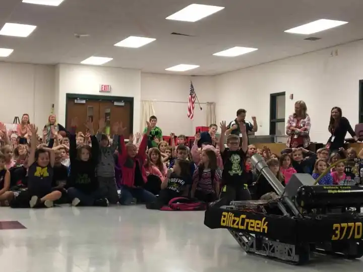 The BlitzCreek team also built a robot they call “T-shirt Bot”, which looks like a tank, and can shoot T-shirts into the air. The team has taken T-shirt Bot to hockey games, and to elementary schools, to get younger students excited about robotics (above).