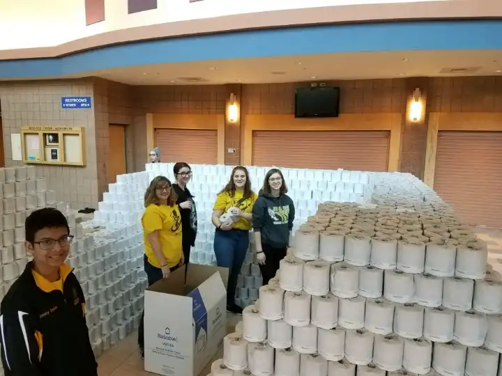 Students at Bullock Creek High School in Midland, Michigan found an unusual way to raise money for their robotics team – they used 27,434 rolls of toilet paper to build the world’s largest toilet paper pyramid.