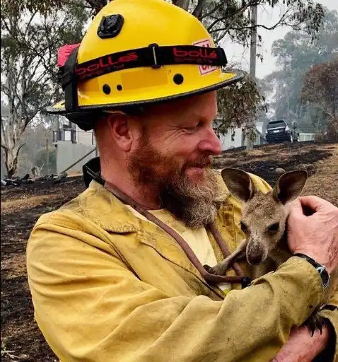 A scientist at the University of Sydney says that over 1 billion animals may have been killed in the fires. The picture shows USDA Forest Service fire fighter Dave Soldavini, who is volunteering, with a rescued joey (young kangaroo).