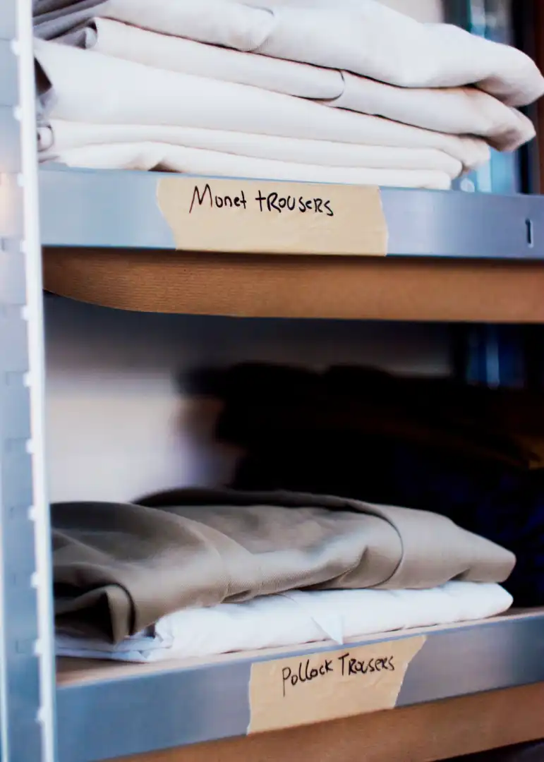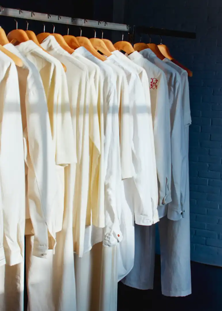 Once ready, pieces make their way to the brand’s flagship boutique, which opened last summer. Located in a former ironmonger’s within walking distance of the atelier, the airy boutique also has an events space, where the brand’s creative clientele – a mix of film producers, architects, graphic designers and gallery owners – get together to host panel discussions, see exhibitions or celebrate their own milestones. Opening up their space to others is part of having a “regenerative mindset”, say the duo, so they make sure that part of the shop is always available for clients to hire.