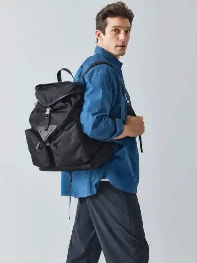 overshirt byAndWander, t-shirt byCorneliani, trousers bySnow Peak, backpack byPrada Re-Nylon