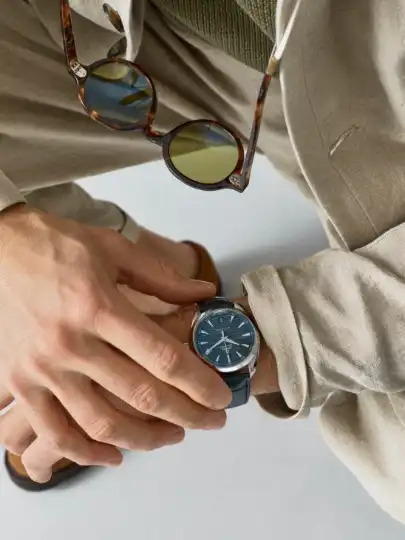 Jacket and trousers by Hermès, shirt by Massimo Alba, glasses by Oliver Peoples, pen by ST Dupont,