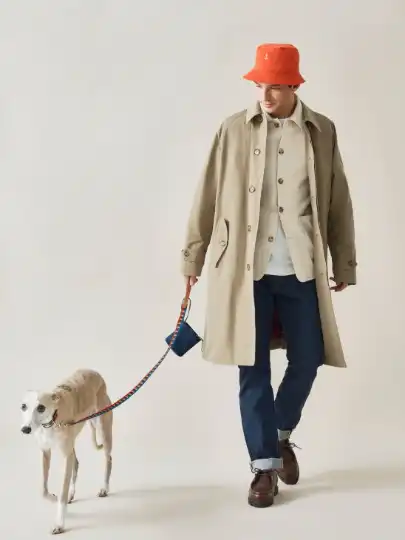 coat and t-shirt byBaracuta, jacket byLoro Piana, jeans by ResolutefromTrunk, shoes byParaboot, hat byLa Paz, dog leash, dog pouch and dog collar byHermès